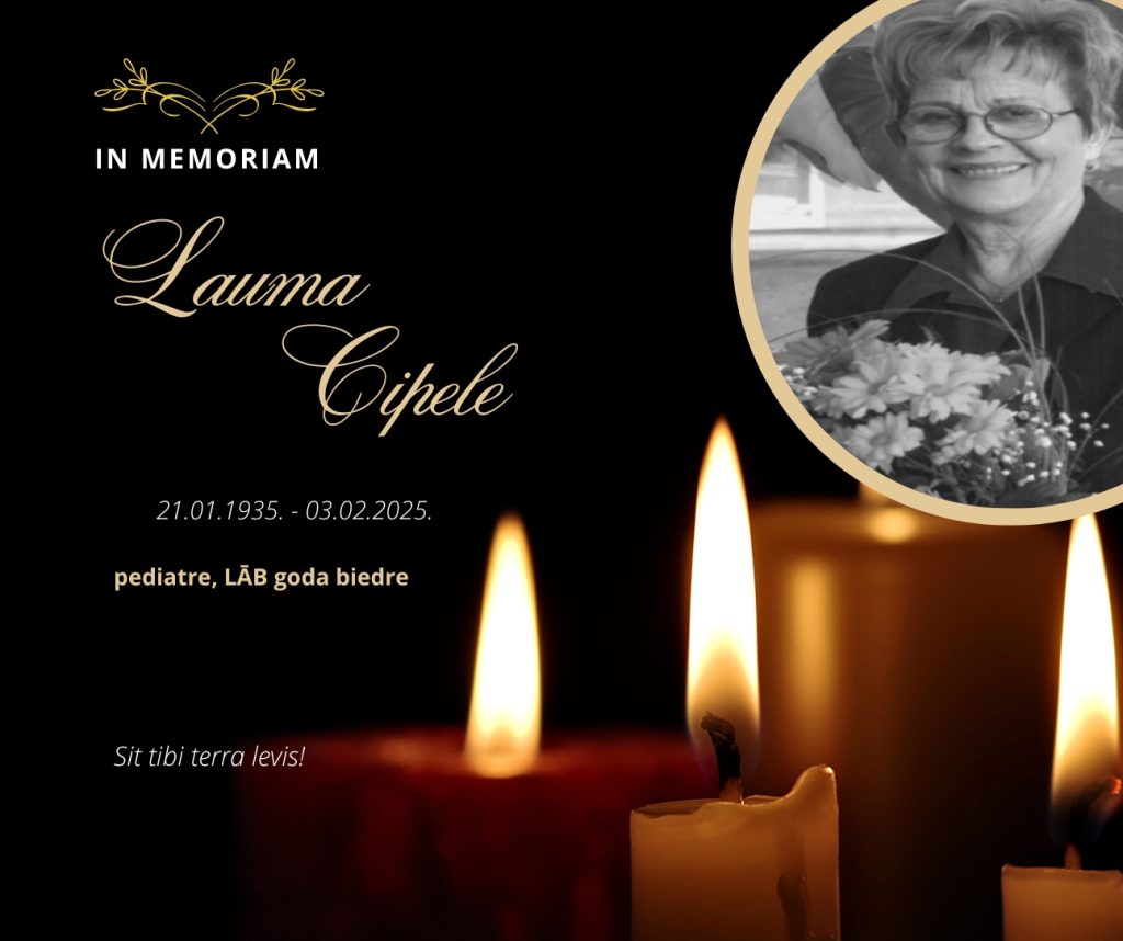 Ar dziļām skumjām paziņojam, ka 2026. gada 3. februārī mūžībā devusies izcilā ārste, ilggadējā bērnu medicīnas speciāliste un sirsnīgs cilvēks — Dr. med. Lauma Cipele (21.01.1935–03.02.2026).